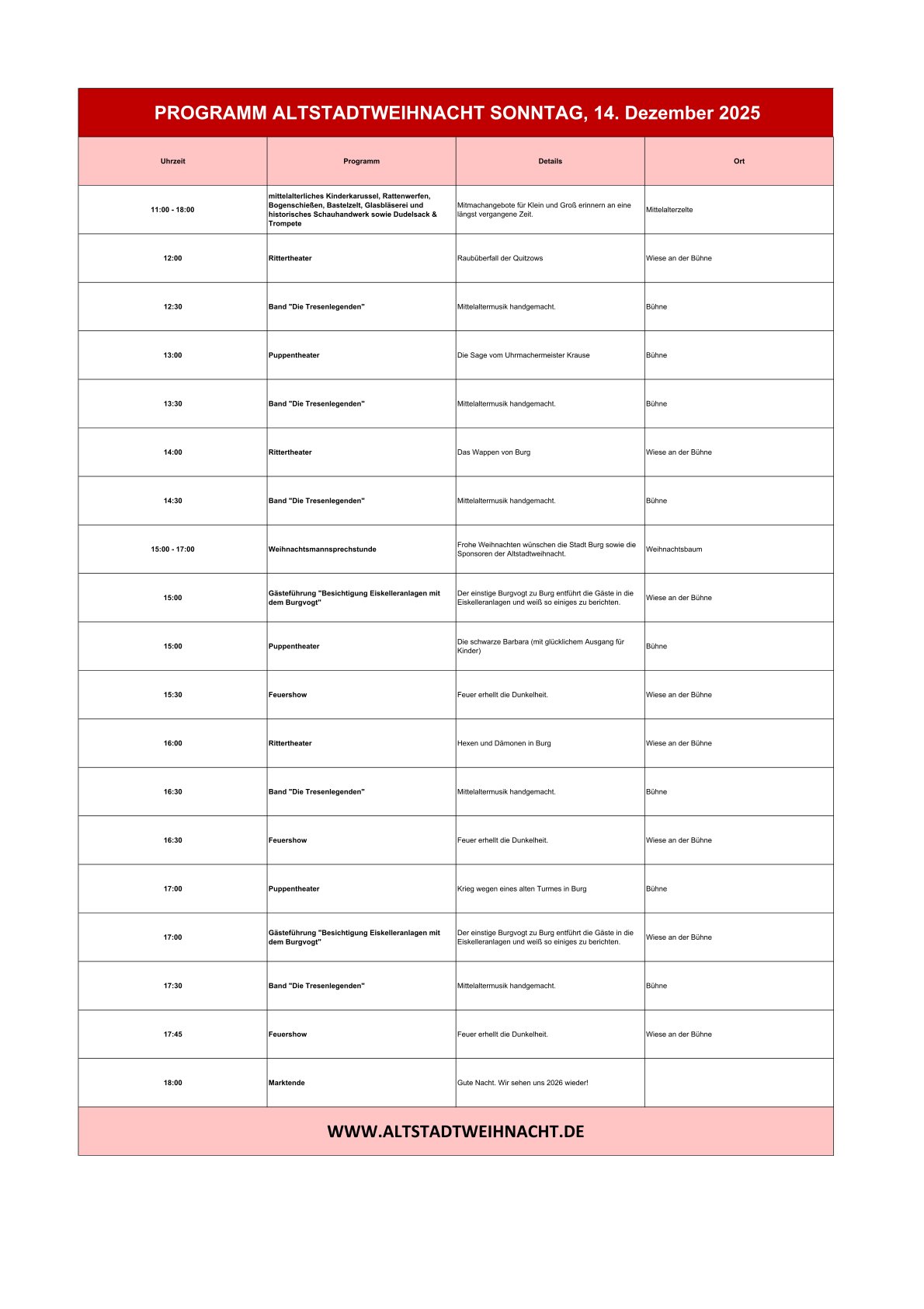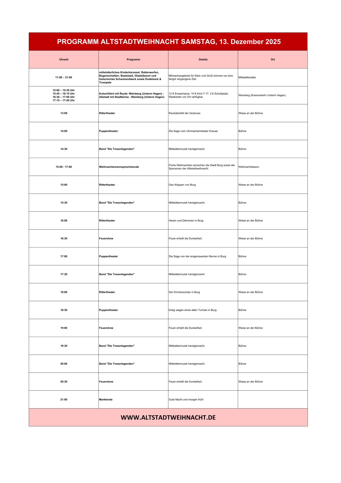 Historischer Weihnachtsmarkt, Livemusik, Kinderprogramm, mittelalterliches Schauhandwerk, Gaukelei und vieles Mehr. Alle Informationen zu den Standorten, Adressen, Programmen, Parkplatzadressen und Mehr sind in dem Programmflyer veröffentlicht. Das Programm ist in der Tourist-Information sowie unter Prospekte & Downloads zum Download erhältlich.